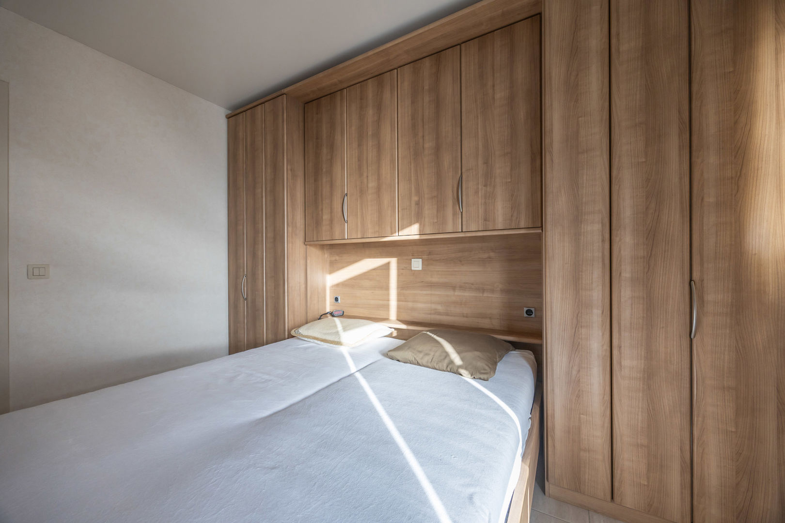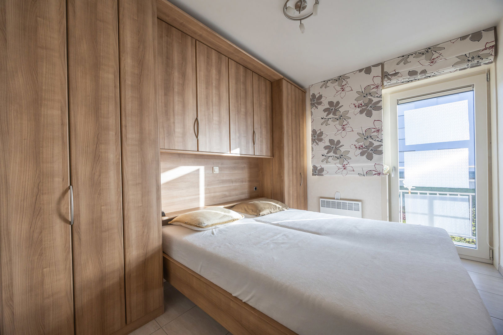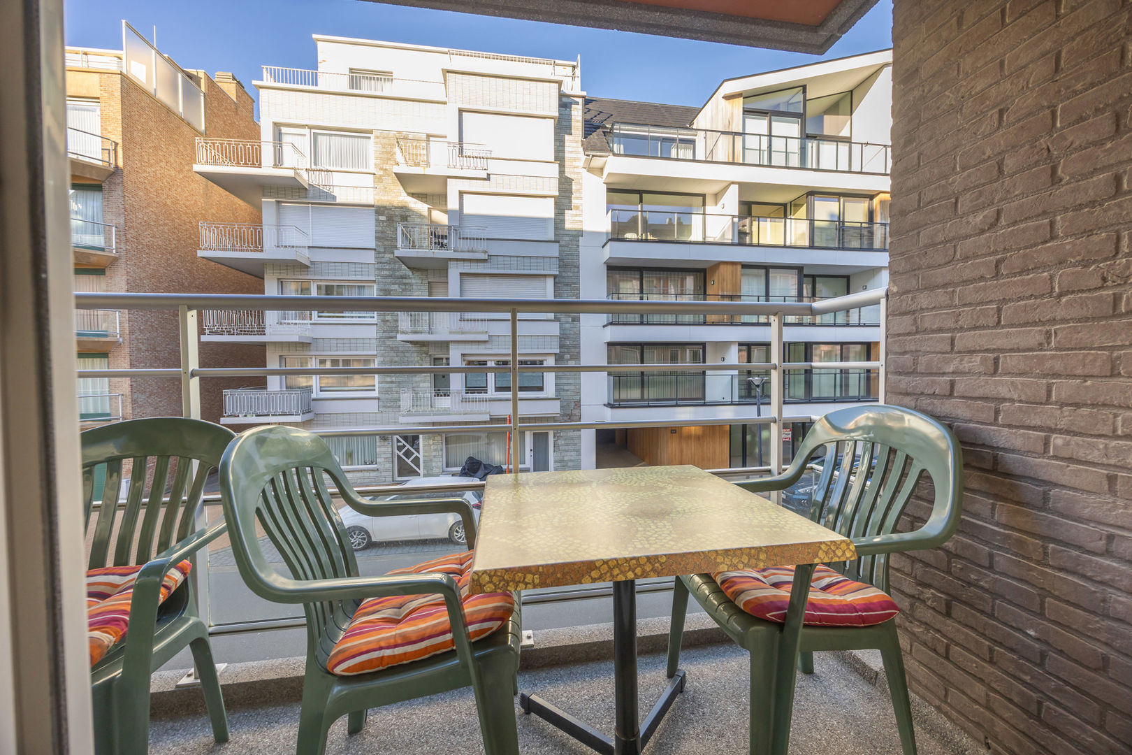 L’appartement comprend une chambre spacieuse avec placards intégrés, offrant un bel espace de rangement et une finition soignée. Celle-ci donne accès à une belle terrasse ensoleillée. La salle de bains est équipée d’une baignoire avec possibilité de douche et d’un meuble lavabo moderne. Un WC séparé complète l’ensemble.