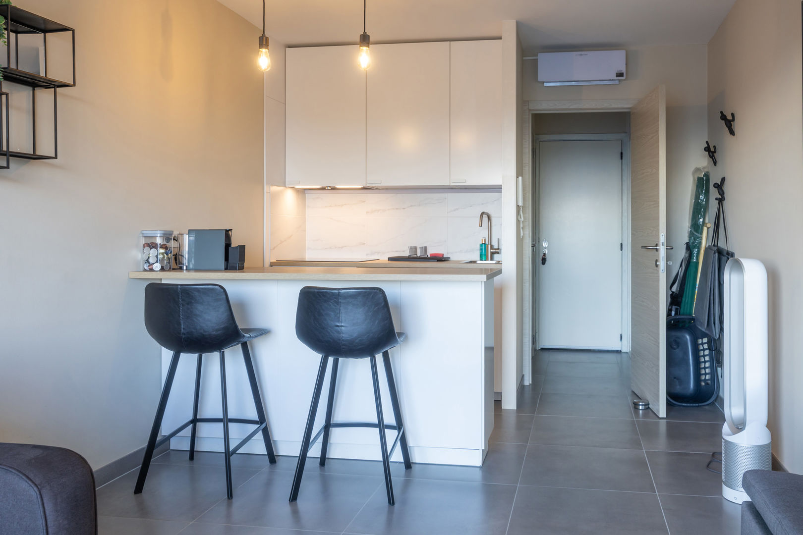 Résidence ROYAL : au 6e étage, studio meublé, prêt à emménager, entièrement rénové, situé à l’arrière (côté ensoleillé) de la Résidence ROYAL avec vue dégagée sur les Polders. Le séjour lumineux avec cuisine ouverte donne accès à la belle terrasse ensoleillée où vous pourrez profiter en toute intimité du calme. Hall d’entrée avec espace de rangement et belle salle de bains avec douche, lavabo et toilette. Finition moderne, agencement pratique et bien entretenu. De plus, vous disposez d’une cave privative, idéale pour le matériel de plage et les vélos. Façades et toitures récemment rénovées et isolées. Parfait comme seconde résidence ou investissement à la côte, à distance de marche de la mer, des commerces et des transports en commun.
