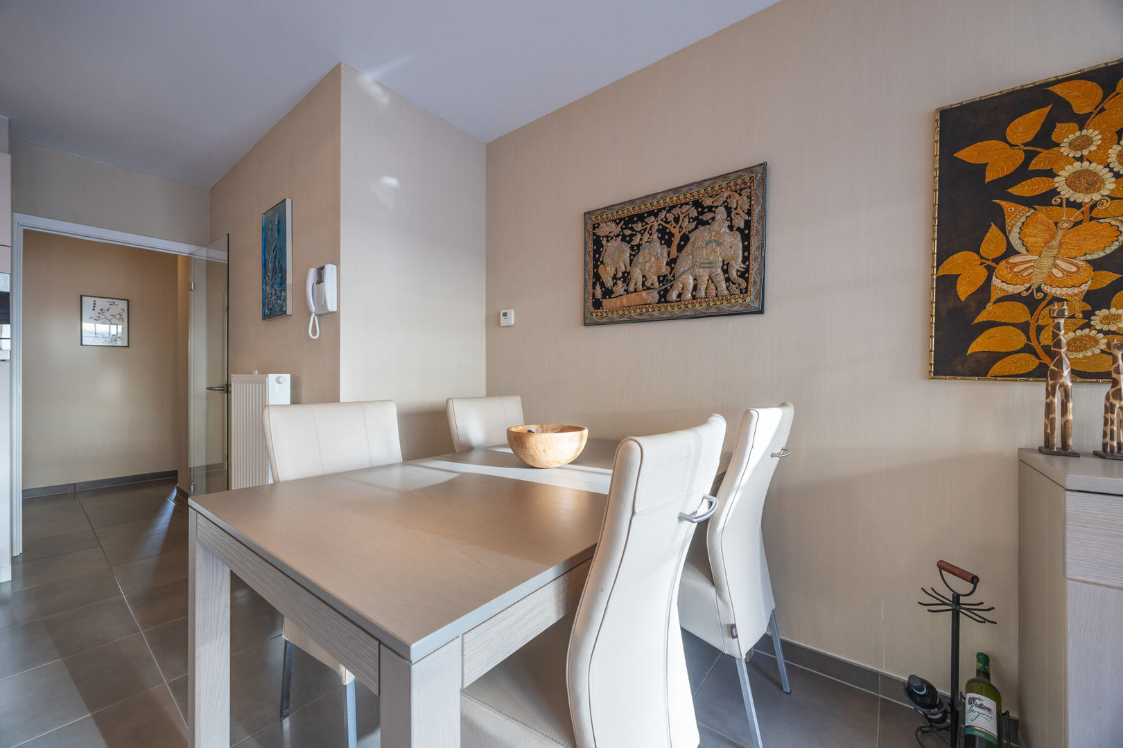 Het appartement beschikt over een lichte en gezellige leefruimte met zithoek en eetplaats, die uitgeeft op een aangenaam terras met open zicht op de omgeving. De open, volledig uitgeruste keuken is praktisch ingericht en voorzien van alle nodige toestellen.