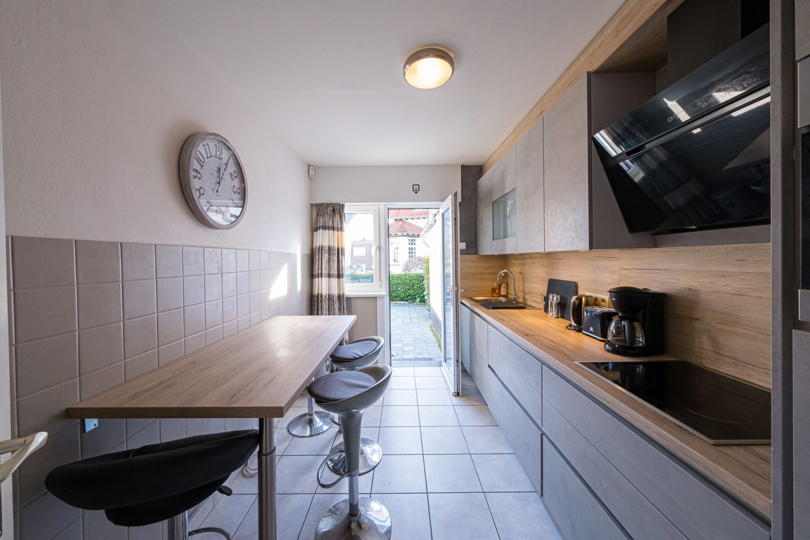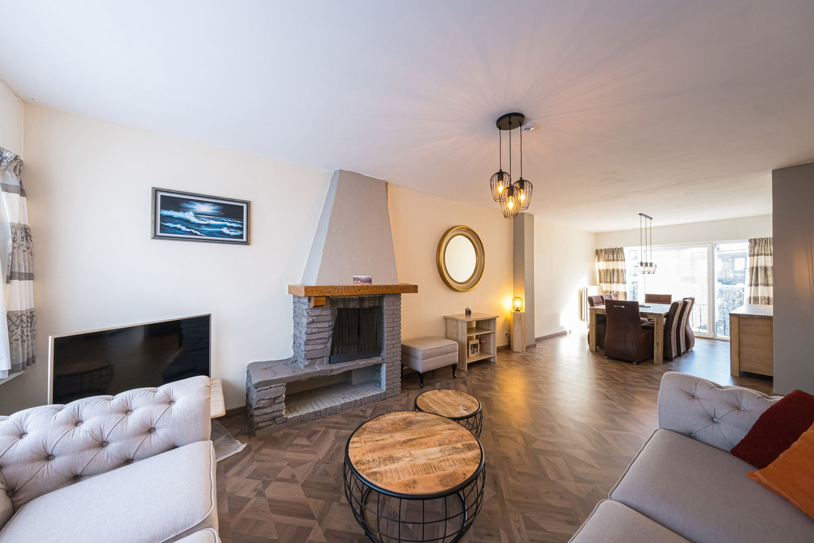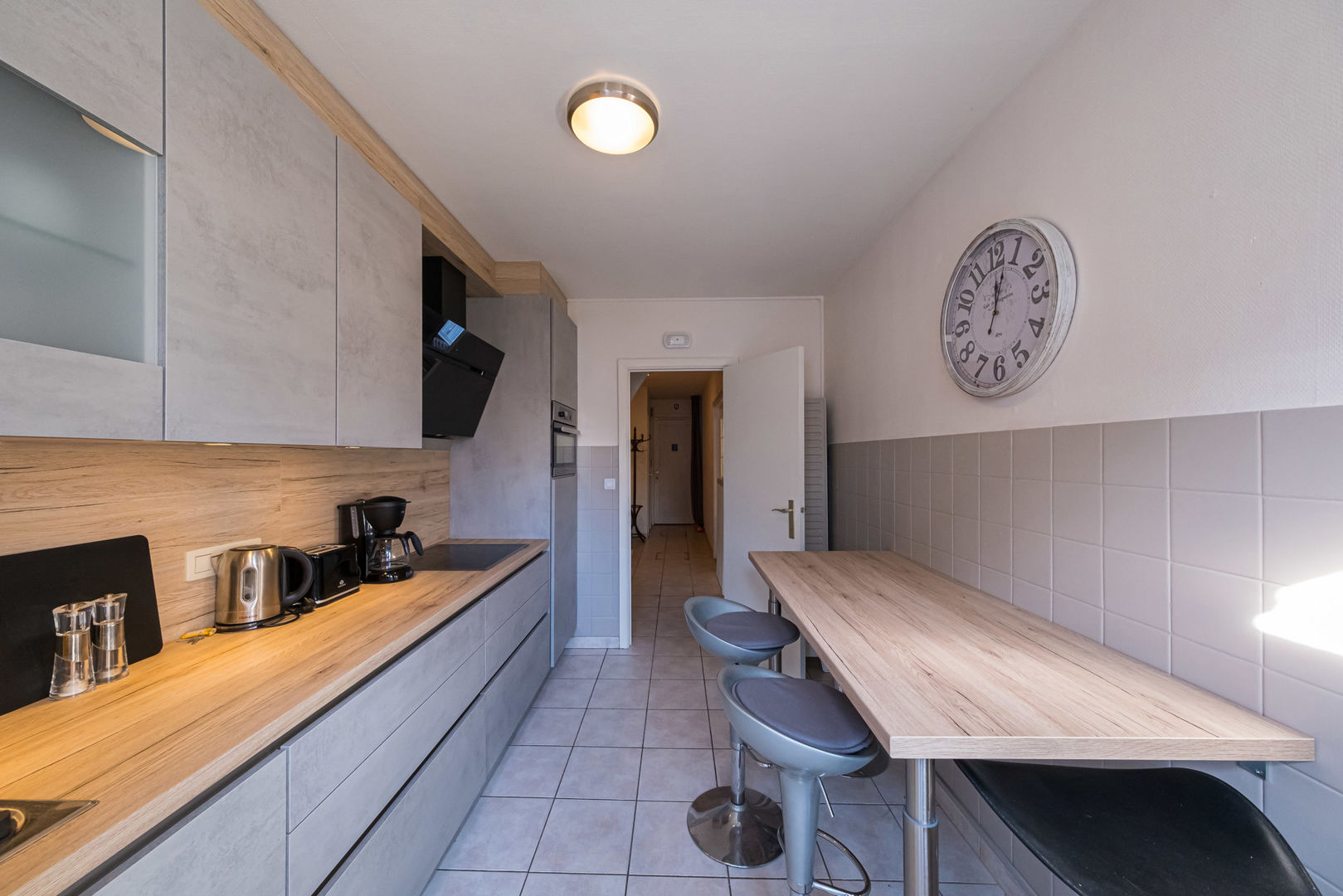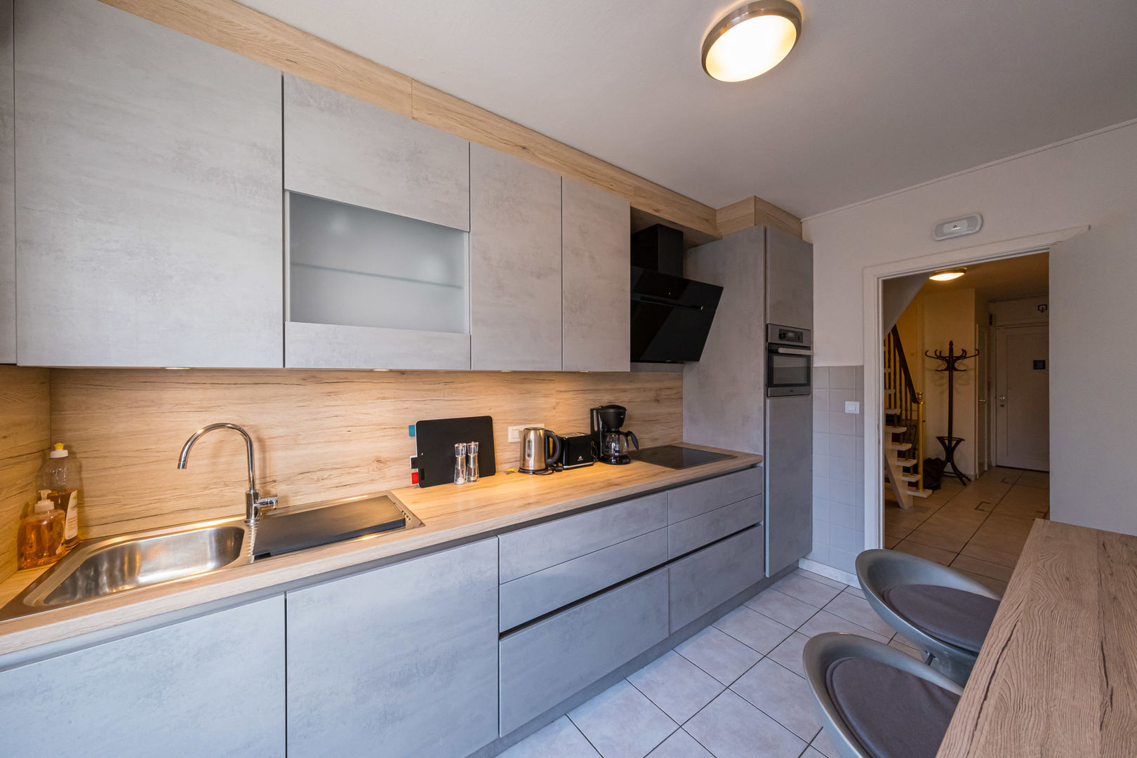 Aansluitend bevindt zich een mooie, volledig uitgeruste keuken die zowel functioneel als gezellig is. Vanuit de keuken heeft u toegang tot een zeer ruim en zonnig terras, perfect voor buitenmaaltijden en ontspannende momenten.